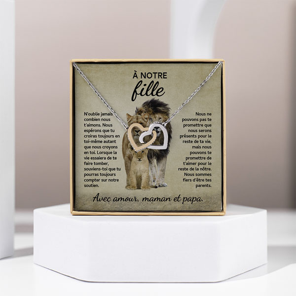 Le collier représente un beau symbole d’amour qui allie un design élégant et une profonde valeur émotionnelle. Doté d’un motif de deux cœurs entrelacés, ce collier représente l’unité et l’amour éternel, ce qui en fait le cadeau parfait pour un être cher.