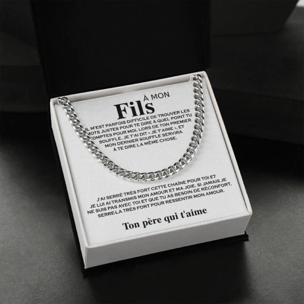 J’AI SERRÉ TRÈS FORT CETTE CHAÎNE POUR TOI ET JE LUI AI TRANSMIS MON AMOUR ET MA JOIE. SI JAMAIS JE NE SUIS PAS AVEC TOI ET QUE TU AS BESOIN DE RÉCONFORT, SERRE-LA TRÈS FORT POUR RESSENTIR MON AMOUR.